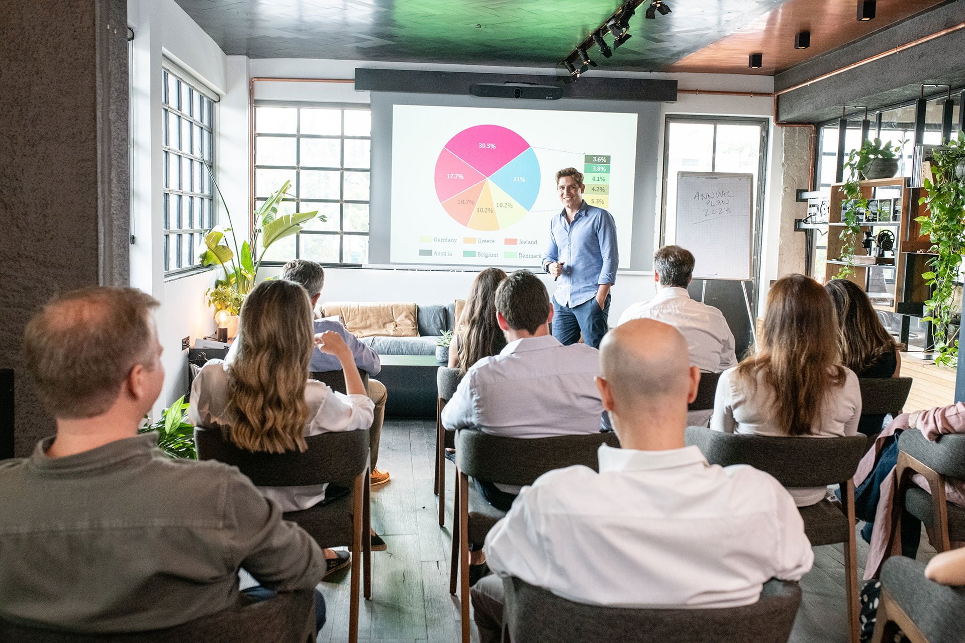 SOLID’s bright and airy space will inspire every keynote speaker to give their very best. In our experience, this versatile auditorium setup is the perfect option for large group briefings, Q&A sessions, and other events with a large audience. A podium, armchairs, or a table can also be placed in front of the screen facing the audience.